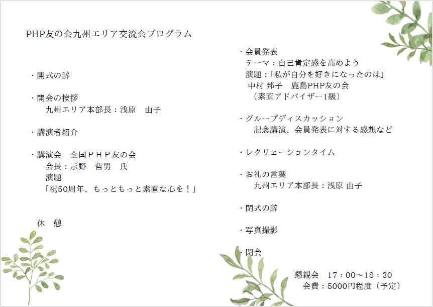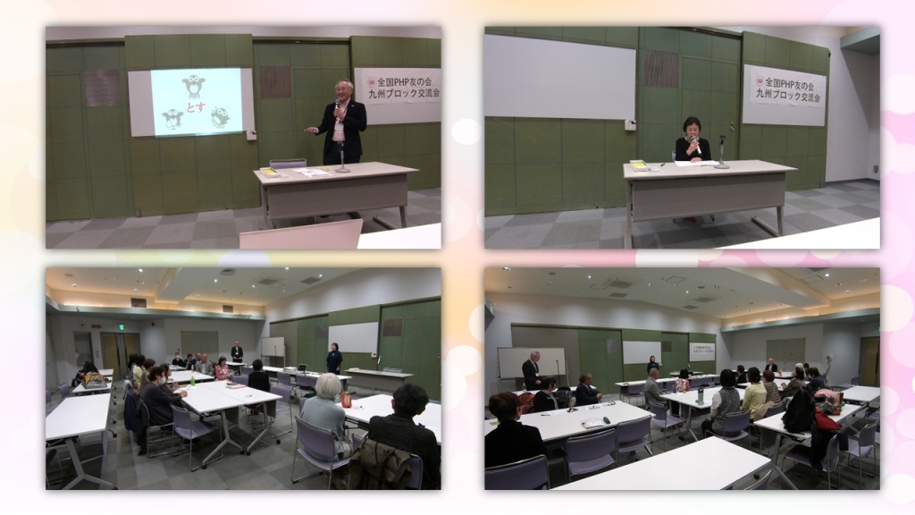 全国PHP友の会 示野哲男会長の講演(祝50周年、もっともっと素直な心を!)、佐賀県鹿島PHP友の会 中村邦子氏の会員発表(テーマ:自己肯定感を高めよう/発表内容:「私が自分を好きになったのは」)を行いました。その後、講演、会員発表に関しのグループディスカッション、レクリエーションと盛りだくさんのスケジュールでしたが、あっという間の三時間が過ぎました。