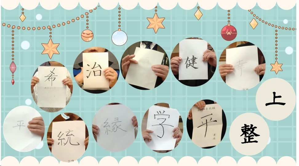 メインイベントは各自今年2023年の振り返りと来年の目標を漢字一文字で発表するコーナーでした。「希」「祝」「間」「健」「幸」「平」「上」「統」「整」「縁」「治」「学」という素晴らしい漢字が発表されました。今後益々のPHP活動全体の底上げと発展、世界平和を願う会員の想いが熱く伝わってきました。