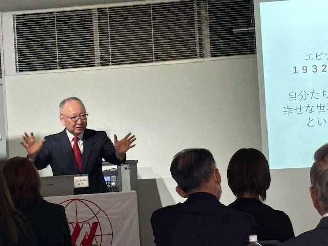 講話では、松下幸之助の生涯について、貧乏・無学歴・病気というハンディから這い上がり「経営の神様と」よばれた逆転発想の所以を振り返ったあと、人間としての成功が天分の発見とその発揮にあることに気づいた三つの要因があると解説。すなわち、①家族の死②自分の運の強さ③未曽有の不況のなかでの成功を挙げ、その過程で、彼は、「人には天から与えられた役割」というものがあるのではないか、自分は経営者という天分が与えられたのではないかと気付いたのではないかと。この経験から、後年松下幸之助は、人間はその天分を活かすことが最も大切であり、個人の幸せとは、持って生まれた天分を発揮し続けることにあると述べていると解説されました。続いて、松下幸之助の生涯における常識を超えたなエピソードとして、恐慌下で一人も解雇しなかった1929年の奇跡、そして産業人の使命に目覚めて、全従業員を前に、『楽土建設』とそのための250年計画を発表した1932年の奇跡を紹介、