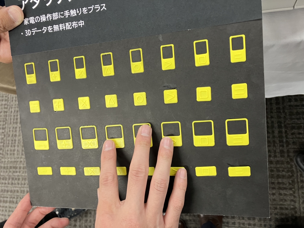 私も出展を回りました。まず真っ先に伺ったパナソニックのブースでは、“アタッチメントプラグ”ではなく“アタッチメントチップ”という凹凸シールを手で触れました。最近の家電製品にはボタンに凹凸がないものも増えていて、目の見えない方に限らず子育て中の方やご高齢の方もご不便を感じておられるようです。私も自宅で家電のボタン操作がふとわからなくなることがあり、こうした無償サービスがあることは非常にありがたいと感じます。