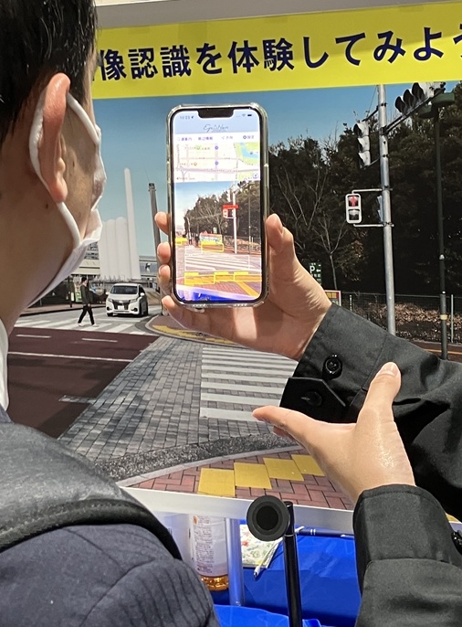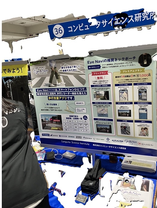 次に、コンピュータサイエンス研究所のブースでは視覚障がい者歩行支援アプリ「Eye Navi」を体験できました。Eye Naviをスマートフォンにインストール・起動することで、見えない・見えにくい方が単独で外出・歩行する際、信号の色や車止めといった障害物を音声で知らせてくれ、目的地まで道案内してくれるという優れモノです。実は私自身最近、音響信号機の音が出ない時間帯に赤信号を渡りそうになりヒヤッとしたことがあり“このアプリをすぐに使わなければ!”と強く感じました。