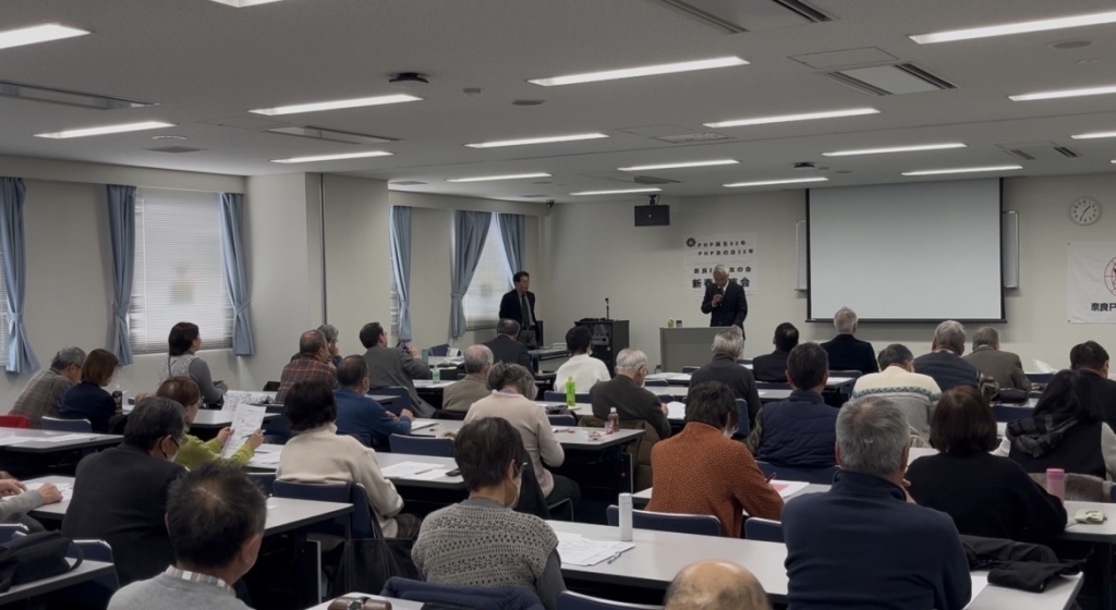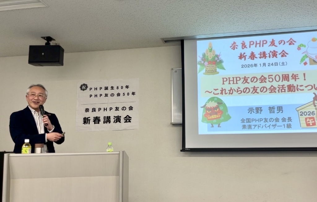 奈良PHP友の会は寒さ厳しい1月24日(土)午後、JR奈良駅に近い奈良市生涯学習センター会議室で、新春講演会2026を開催しました。今年はPHP研究所設立80周年、PHP友の会発足50年の記念すべき年に因み、第1部ではPHP研究所首席研究員の川上恒雄氏による講演「PHP誕生から80年 ~今なお生きる松下幸之助の思い~」、第2部では全国PHP友の会会長の示野哲男氏による講演「PHP友の会50周年~これからの友の会活動について~」の2本立てで行われました。