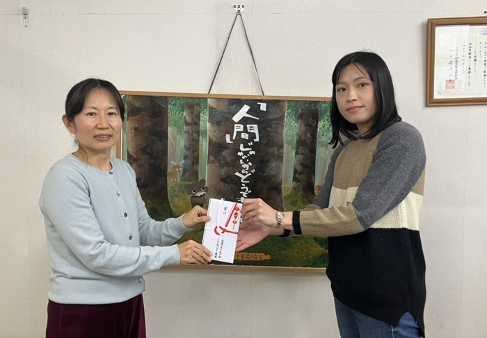 最後に、室谷様へ桐本さんから寄付金をお渡ししました。室谷様からは、「今回いただいたご寄付は、人とクマとの住み分け対策や奥山森の再生のため、有効に活用いたします」とのお言葉をいただきました。